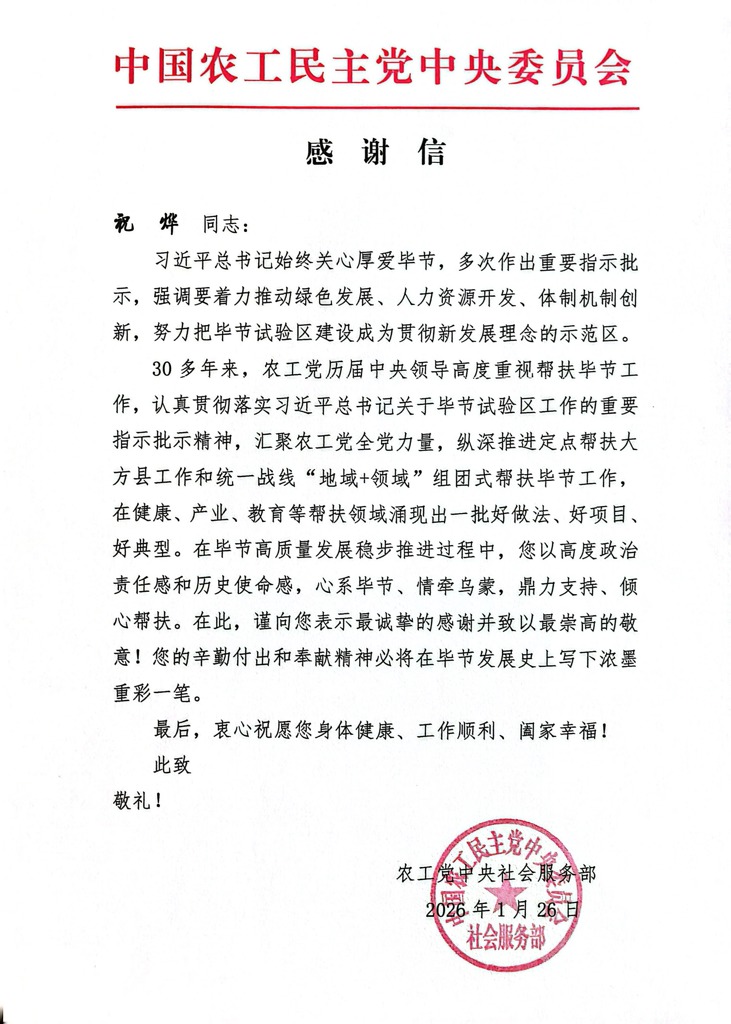 2026-02-05近日,农工党中央向我中心院长祝烨同志致送感谢信,对其倾情投身毕节市大方县,以“地域+领域”组团式帮扶模式助力当地医疗事业发展所付出的努力与取得的成效,表示衷心感谢并致以崇高敬意。2022年,祝烨同志受聘为大方县人民医院学术院长,全面负责学科建设工作。他率队深入一线调研,精准把脉医院发展需求,通过定期派驻专家开展教学查房、门诊带教、手术指导,并建立远程会诊与培训平台,将华西优质的医疗技术和管理经验源源不断地输送至乌蒙山区。在各方共同努力下,大方县人民医院于2023年6月成功完成三级综合医院认定,摆脱十余年二甲历史,并首次入选“中国县级医院500强”,实现了国家发明专利和SCI学术论文“零的突破”,多项高难度诊疗技术落地开展,医院综合服务...